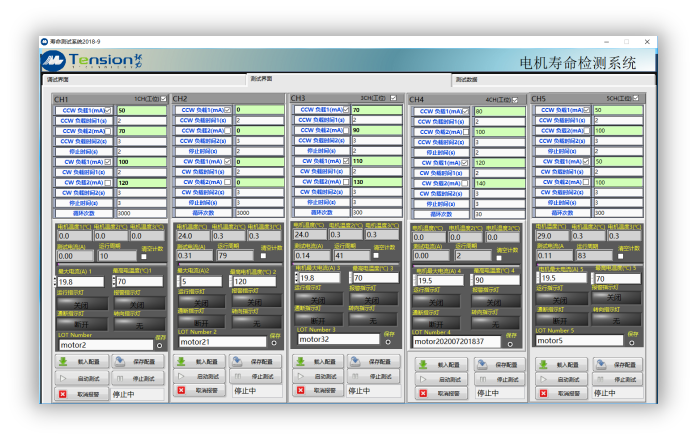 •可以通過改變制動(dòng)器電流來設(shè)定不同的電機(jī)加載,同時(shí)可以通過上位機(jī)軟件任意設(shè)定電機(jī)的工作與停止時(shí)間,最高工作循環(huán)為99.99萬次,循環(huán)次數(shù)達(dá)到后自動(dòng)停機(jī),其中任何一工位出現(xiàn)問題只會(huì)自動(dòng)停止該工位的運(yùn)行